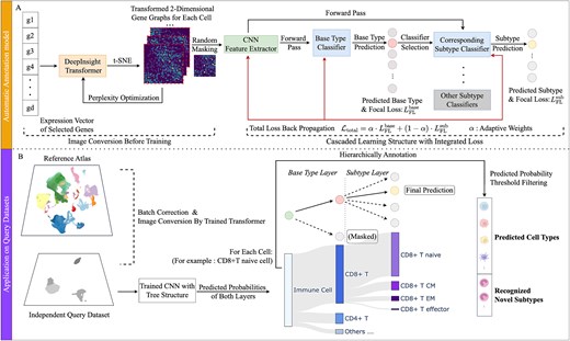免疫细胞分类一直面临三大挑战,即1)层次结构复杂:免疫细胞像家族树一样有层级关系,从大类(比如T细胞)到细分类别(比如辅助T细胞、杀伤T细胞等),传统方法难以兼顾;2)罕见细胞易被忽略:某些重要的免疫细胞亚型数量稀少,在数据分析中容易被 淹没 ;3)结果难以解释:许多AI模型像黑箱,科学家无法理解其分类依据。