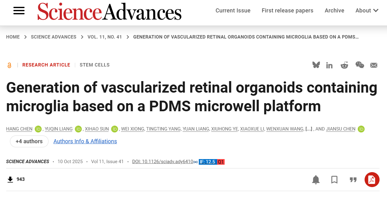 Chen H, Liang Y, Sun X, et al. Generation of vascularized retinal organoids containing microglia based on a PDMS microwell platform.Sci Adv. 2025;11(41):eady6410. doi:10.1126/sciadv.ady6410