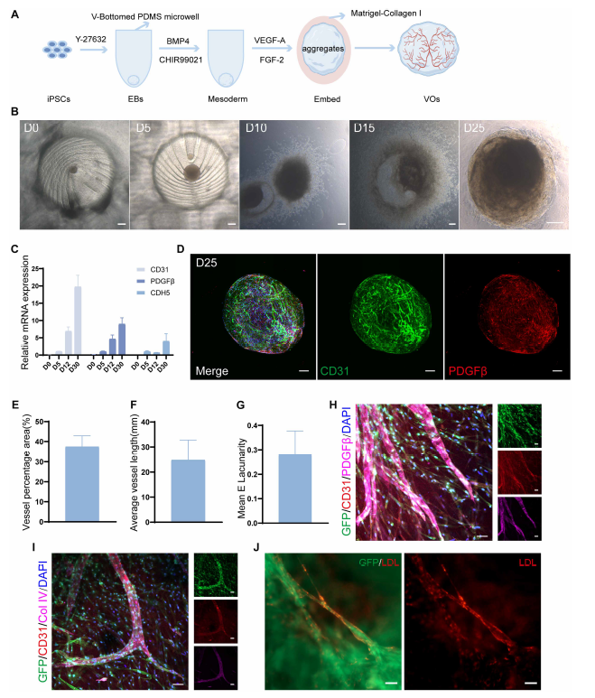 研究团队先从血管类器官入手,改良分化方案后成功生成,还靠V型底部PDMS微孔平台大幅降低了类器官大小的异质性 这对后续实验的重复性至关重要。这些血管类器官不只是 样子像 ,功能也很到位:不仅表达CD31、PDGF 等血管核心基因,还形成了内皮细胞、周细胞加基底膜的完整血管网络,甚至能高效摄取低密度,完全具备生理活性。