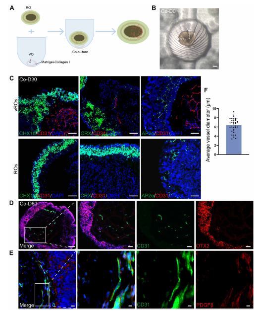 有了合格的血管类器官,团队接着把培养60天的视网膜类器官,和培养5天的血管类器官在PDMS微孔平台里共培养。30到60天后,血管化视网膜类器官的中心就出现了CD31阳性的管状血管结构,这些血管还被周细胞包裹着,直径和人类视网膜毛细血管的典型范围完全匹配。更惊喜的是,长期培养到180天,这个模型依然能同时维持血管结构和视杆细胞、视锥细胞等视网膜关键细胞类型,而且血管的分布模式和体内人类视网膜深层毛细血管的特征高度相似。