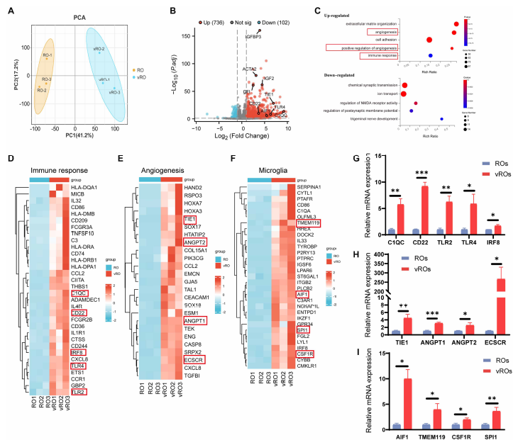 转录组分析给出了更深入的答案:和传统视网膜类器官比,血管化版本里有736个基因上调、102个基因下调,上调的基因集中富集在血管生成、应答等关键生物学过程。实时荧光定量PCR进一步验证,免疫反应相关基因(比如C1QC、TLR2)、血管生成相关基因(比如TIE1、ANGPT2)还有小胶质细胞标志物基因(比如AIF1、TMEM119),在血管化视网膜类器官里的表达都显著升高,这说明模型的血管化过程和免疫应答是紧密关联的。