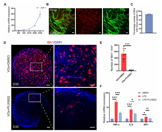 研究还意外发现,生成的血管类器官里天然就含有小胶质细胞 这些细胞呈变形虫形态,主要分布在血管周围,和体内视网膜中小胶质细胞的定位规律一模一样。为了确认这些小胶质细胞的功能,团队用CSF1R抑制剂PLX5622处理,结果大部分小胶质细胞都被清除了;再用脂多糖刺激,肿瘤因子 、白细胞介素8等炎症因子的表达明显上调,证明这些小胶质细胞能正常响应炎症信号。更关键的是,当血管类器官和视网膜类器官融合后,小胶质细胞会主动迁移并整合到视网膜类器官中,而且通过GFP标记证实,这些小胶质细胞主要来源于血管类器官。经脂多糖刺激后,血管化视网膜类器官里促炎因子和抗炎因子的表达都显著上调,说明整个模型具备完整的免疫活性。