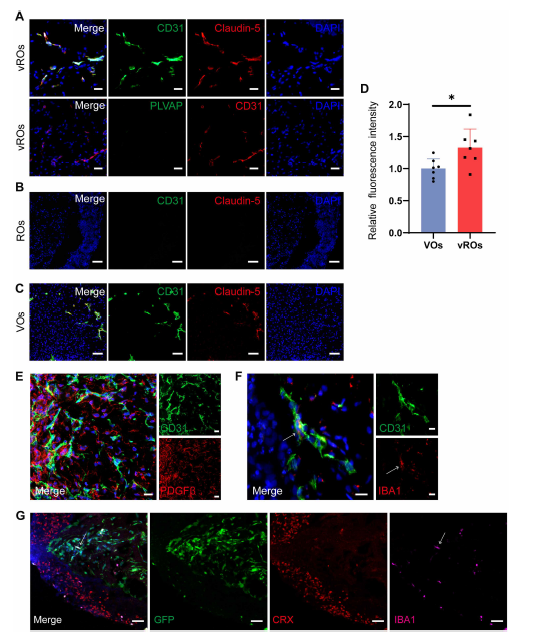 最贴近临床价值的是,这个血管化视网膜类器官还具备了内血-视网膜屏障的核心特征:它表达紧密连接蛋白claudin-5,却不表达内皮窗孔标志物PLVAP 这正是体内内血-视网膜屏障的典型分子特征。同时,血管结构周围有周细胞和小胶质细胞共同包裹,形成了类似神经血管单元的结构,进一步证明模型在结构上已经高度贴近体内视网膜的生理状态。